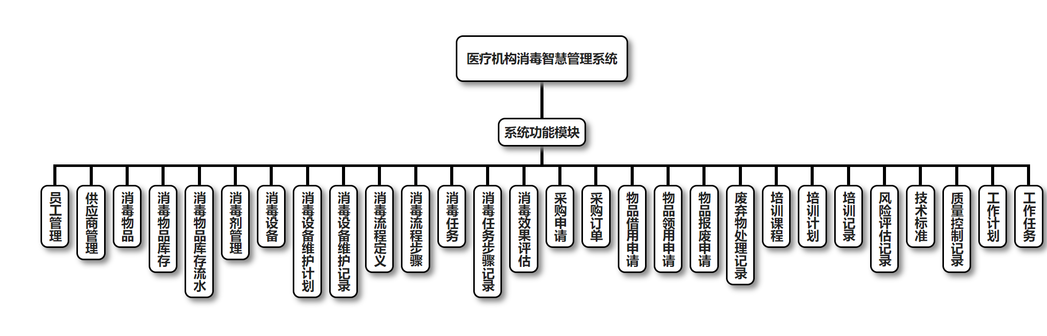 医疗机构消毒智慧管理系统的主要功能包括:员工管理、供应商管理、消毒物品管理、消毒物品库存管理、消毒物品库存流水管理、消毒剂管理、消毒设备管理、消毒设备维护计划管理、消毒设备维护记录管理、消毒流程定义管理、消毒流程步骤管理、消毒任务管理、消毒任务步骤记录管理、消毒效果评估管理、采购申请管理、采购订单管理、物品借用申请管理、物品领用申请管理、物品报废申请管理、废弃物处理记录管理、培训课程管理、培训计划管理、培训记录管理、风险评估记录管理、技术标准管理、质量控制记录管理、工作计划管理、工作任务管理。