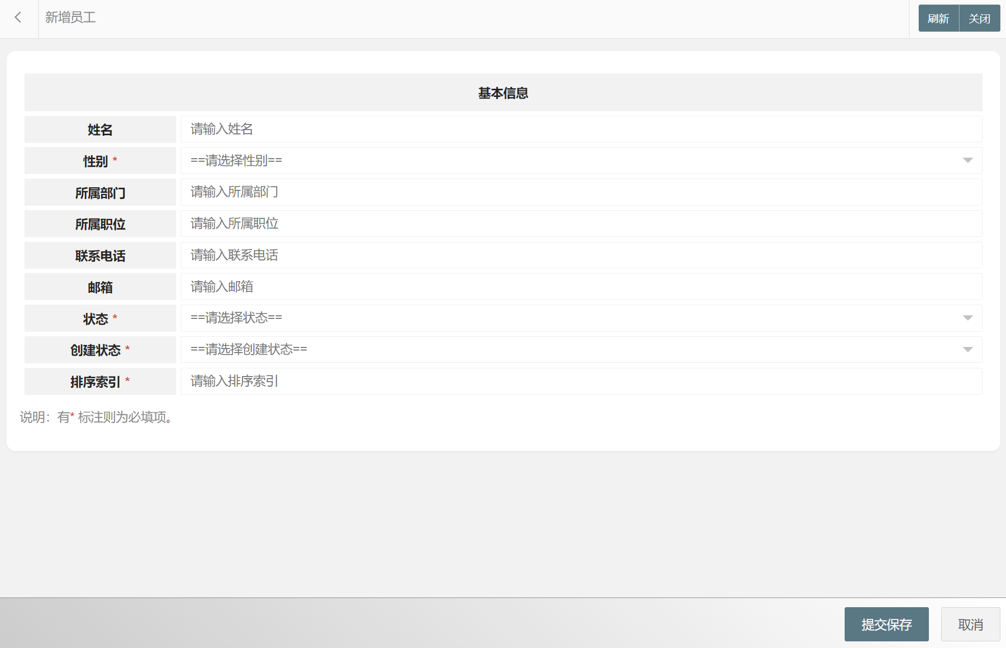 在员工列表中可以选择新增员工、编辑员工、删除员工、搜索员工等。员工属性包括:员工编码、姓名、性别、所属部门、所属职位、联系电话、邮箱、状态等。新增员工界面如图所示: