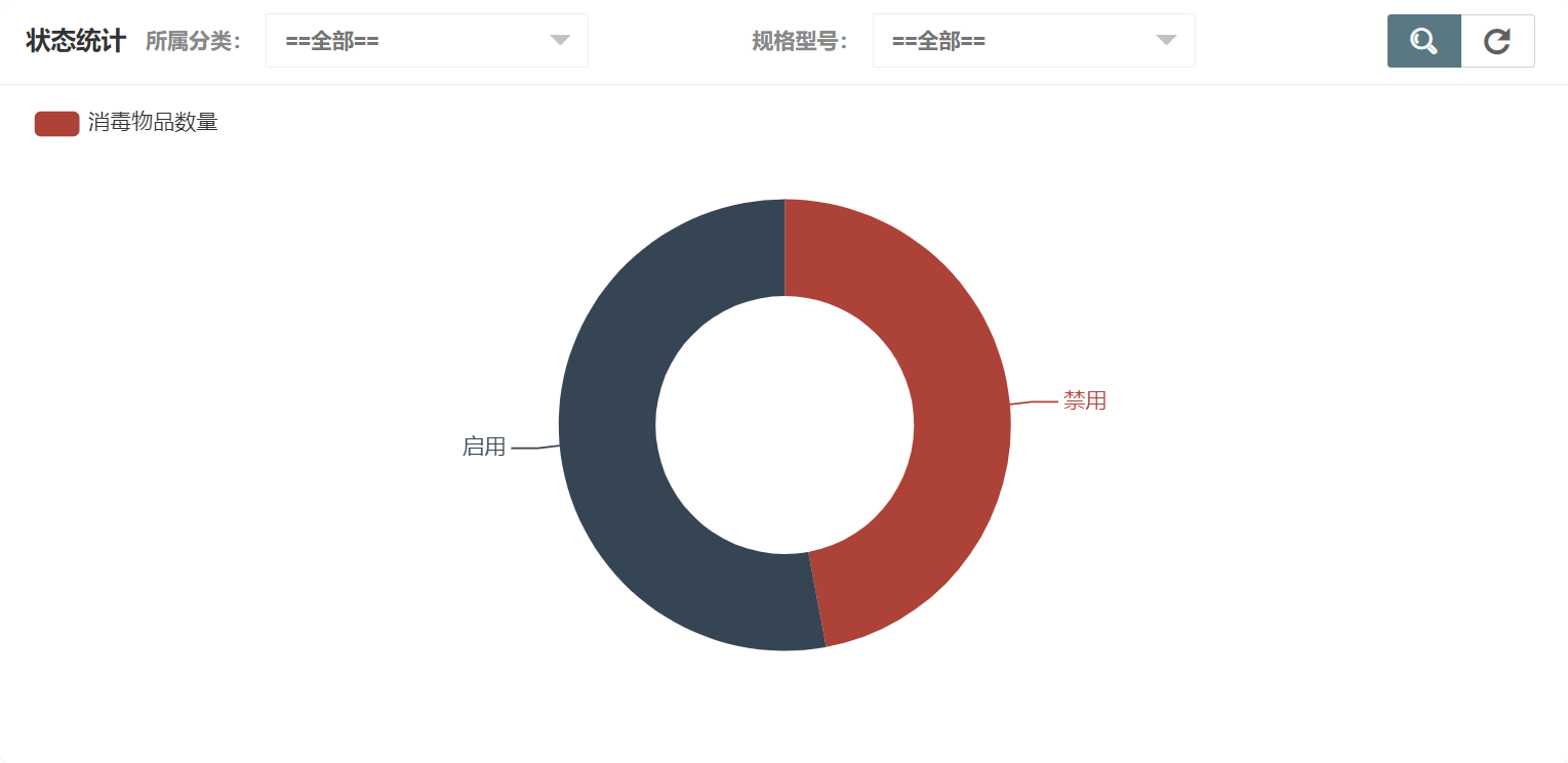 在消毒物品统计中可以看到所属分类统计、规格型号统计、状态统计,状态统计如图所示: