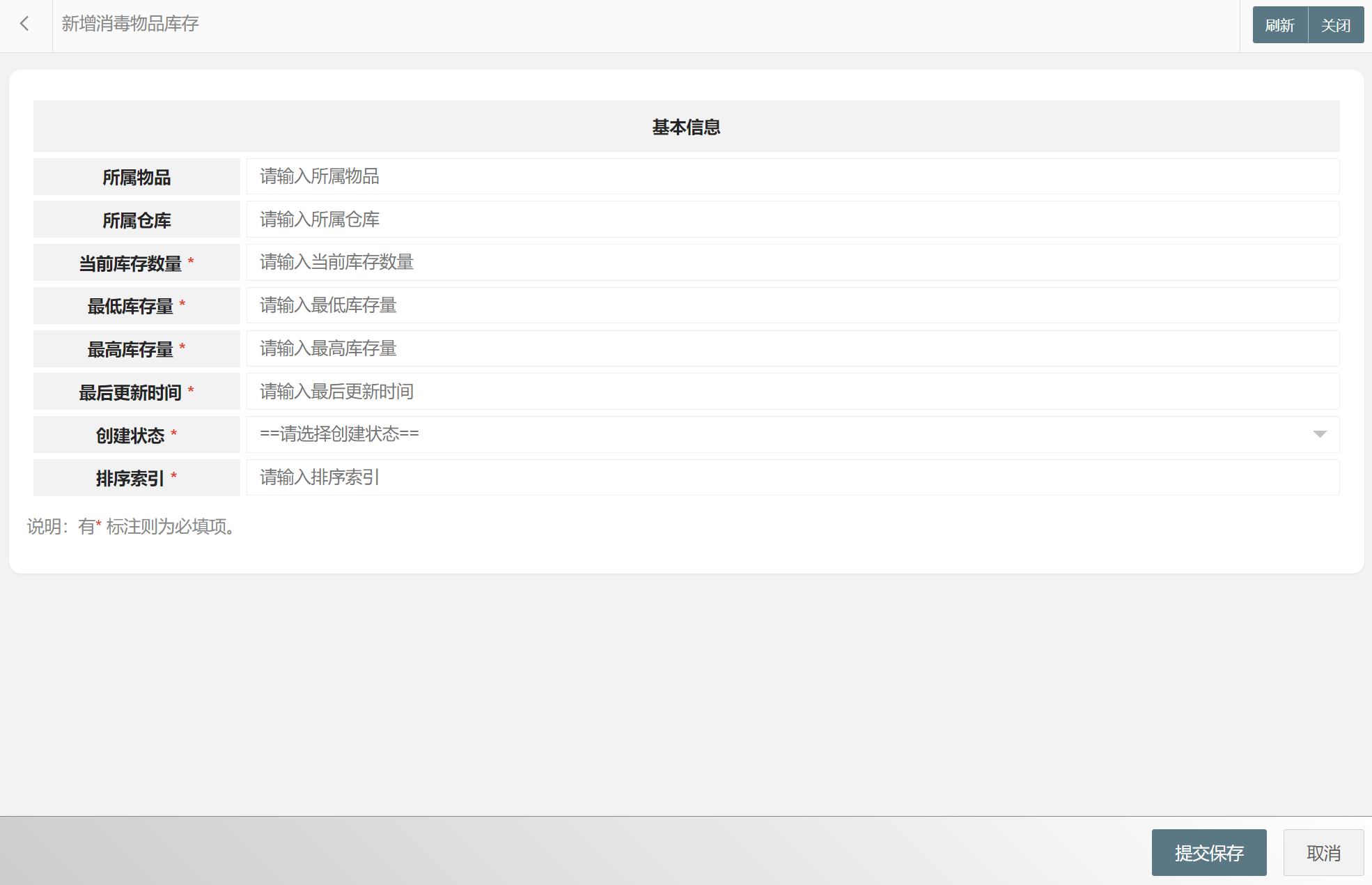 在消毒物品库存列表中可以选择新增消毒物品库存、编辑消毒物品库存、删除消毒物品库存、搜索消毒物品库存等。消毒物品库存属性包括:消毒物品库存编码、所属物品、所属仓库、当前库存数量、最低库存量、最高库存量、最后更新时间等。新增消毒物品库存界面如图所示: