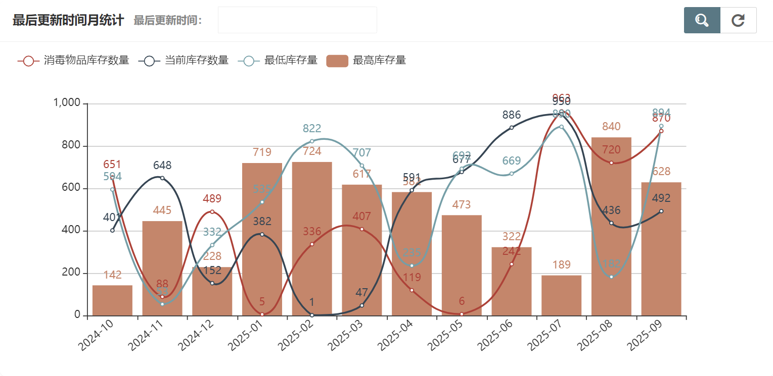 在消毒物品库存统计中可以看到最后更新时间年统计、最后更新时间月统计、最后更新时间日统计,最后更新时间月统计如图所示: