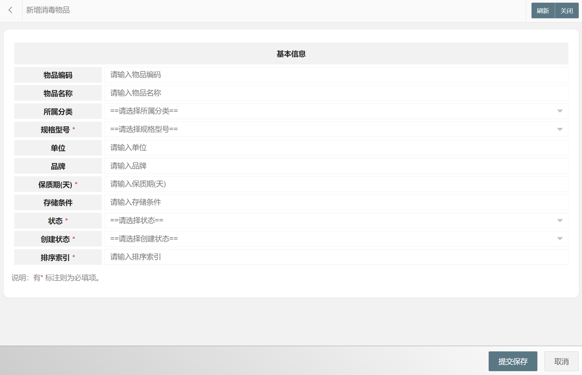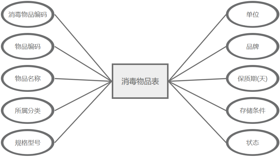 消毒物品管理主要属性包括:消毒物品编码、物品编码、物品名称、所属分类、规格型号、单位、品牌、保质期(天)、存储条件、状态。