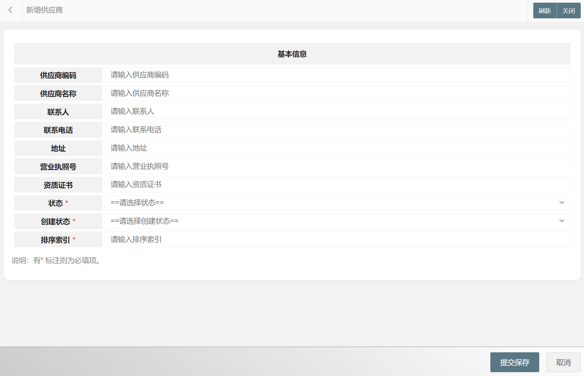 在供应商列表中可以选择新增供应商、编辑供应商、删除供应商、搜索供应商等。供应商属性包括:供应商编码、供应商编码、供应商名称、联系人、联系电话、地址、营业执照号、资质证书、状态等。新增供应商界面如图所示: