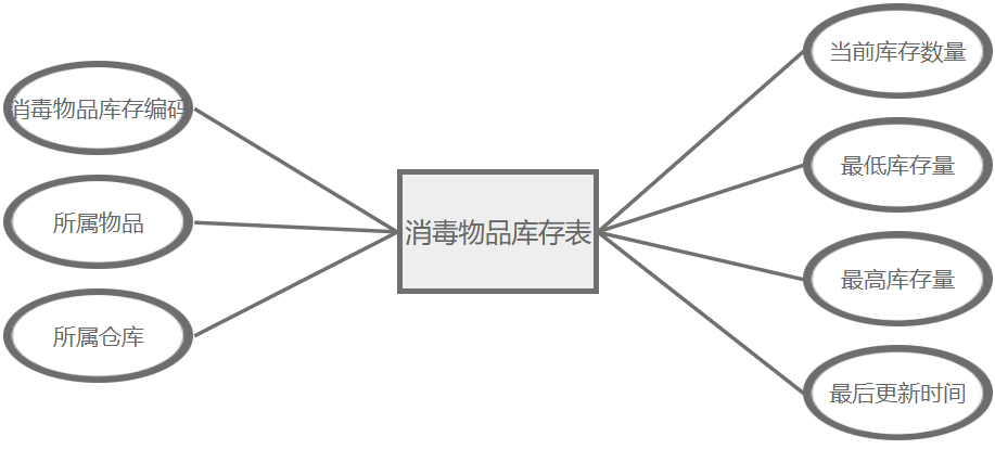 消毒物品库存管理主要属性包括:消毒物品库存编码、所属物品、所属仓库、当前库存数量、最低库存量、最高库存量、最后更新时间。