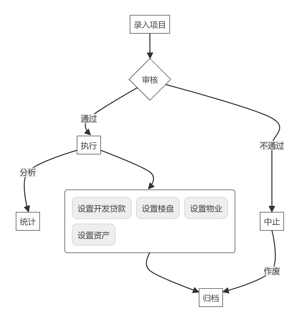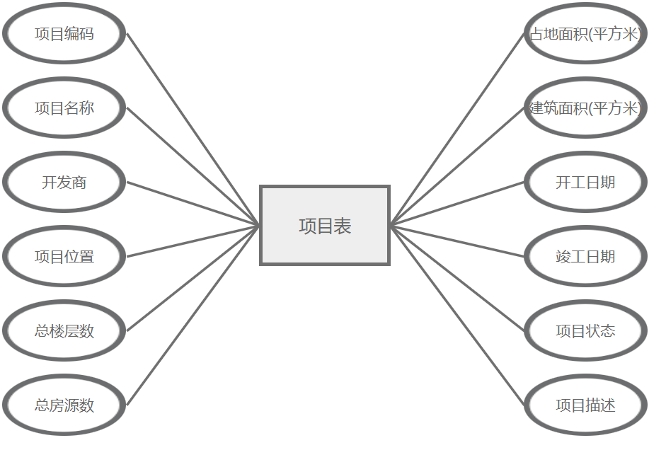 项目管理主要属性包括:项目编码、项目名称、开发商、项目位置、总楼层数、总房源数、占地面积(平方米)、建筑面积(平方米)、开工日期、竣工日期、项目状态、项目描述。