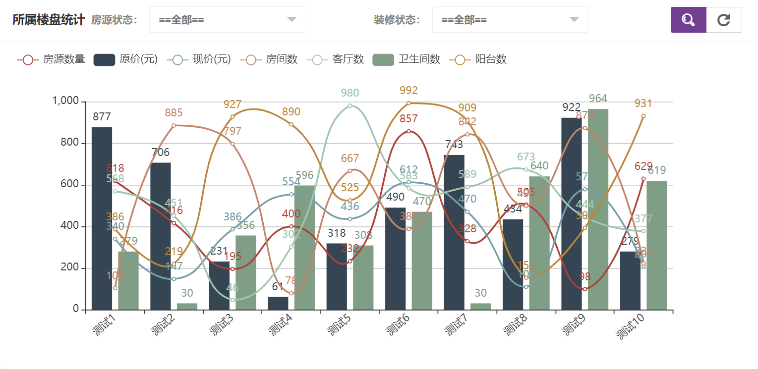 在房源统计中可以看到所属楼盘统计、房源状态统计、装修状态统计,所属楼盘统计如图所示: