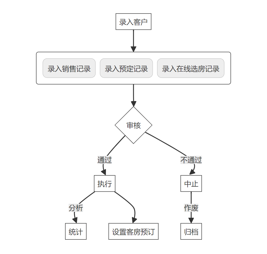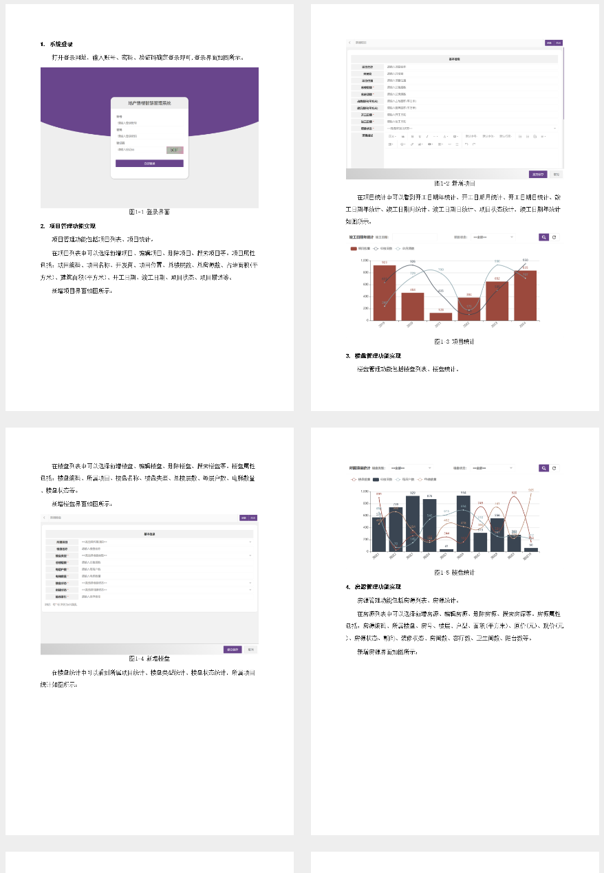 楼盘管理模块主要字段包括:编码、所属项目、名称、类型等。数据录入时需输入以上信息,系统自动填充状态为草稿;数据查询支持按条件筛选如项目名或楼盘类型,生成报表供审核参考;信息变更仅限于修改非关键属性如备注,重要变动需提交审批流程;部门领导进行数据审核确认无误后更新至正式版本并归档;统计分析功能通过图表展示各维度数据分析结果,例如销售量、客户满意度等,并提供导出Excel文件选项。