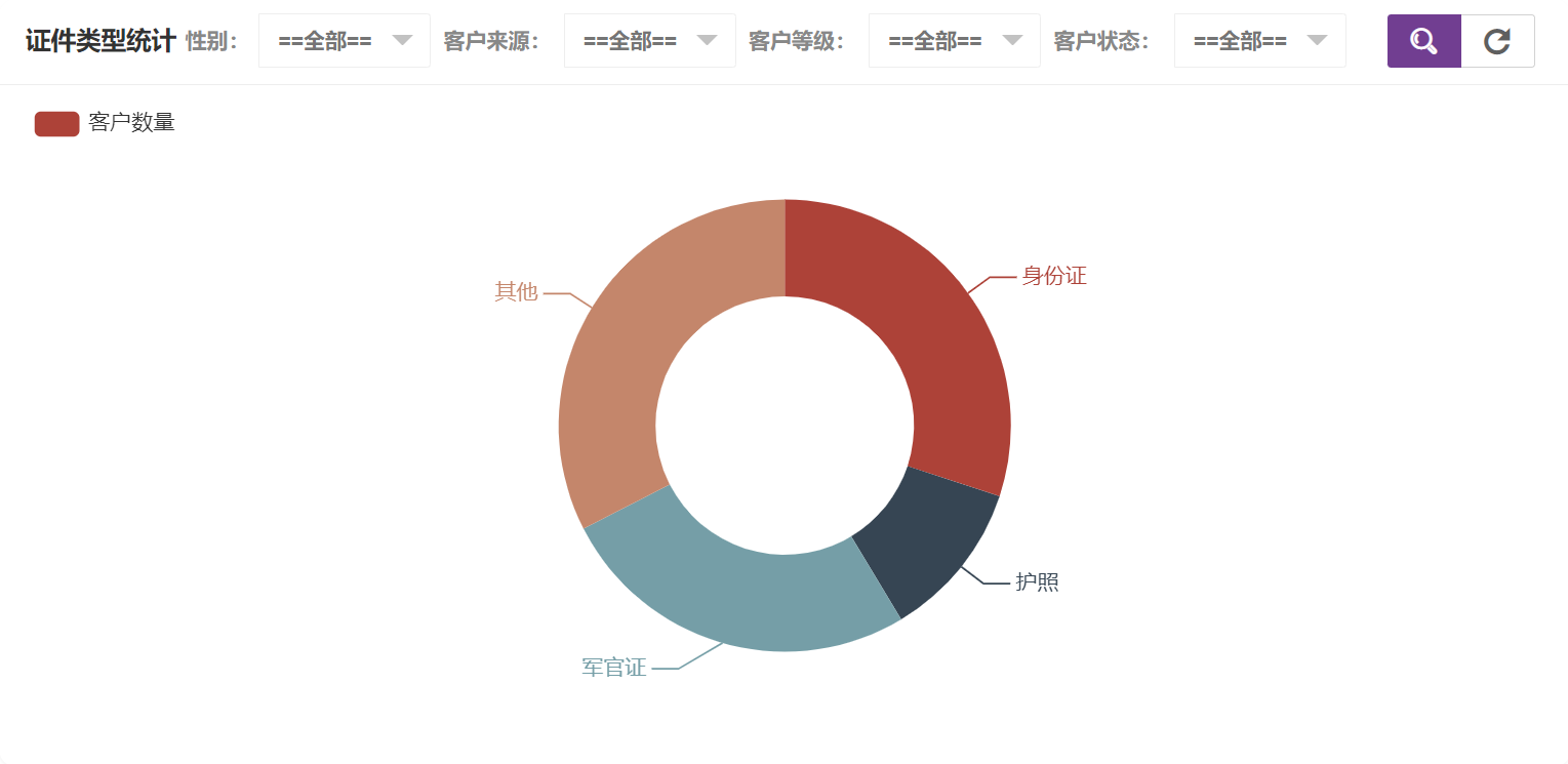 在客户统计中可以看到性别统计、证件类型统计、客户来源统计、客户等级统计、客户状态统计,证件类型统计如图所示: