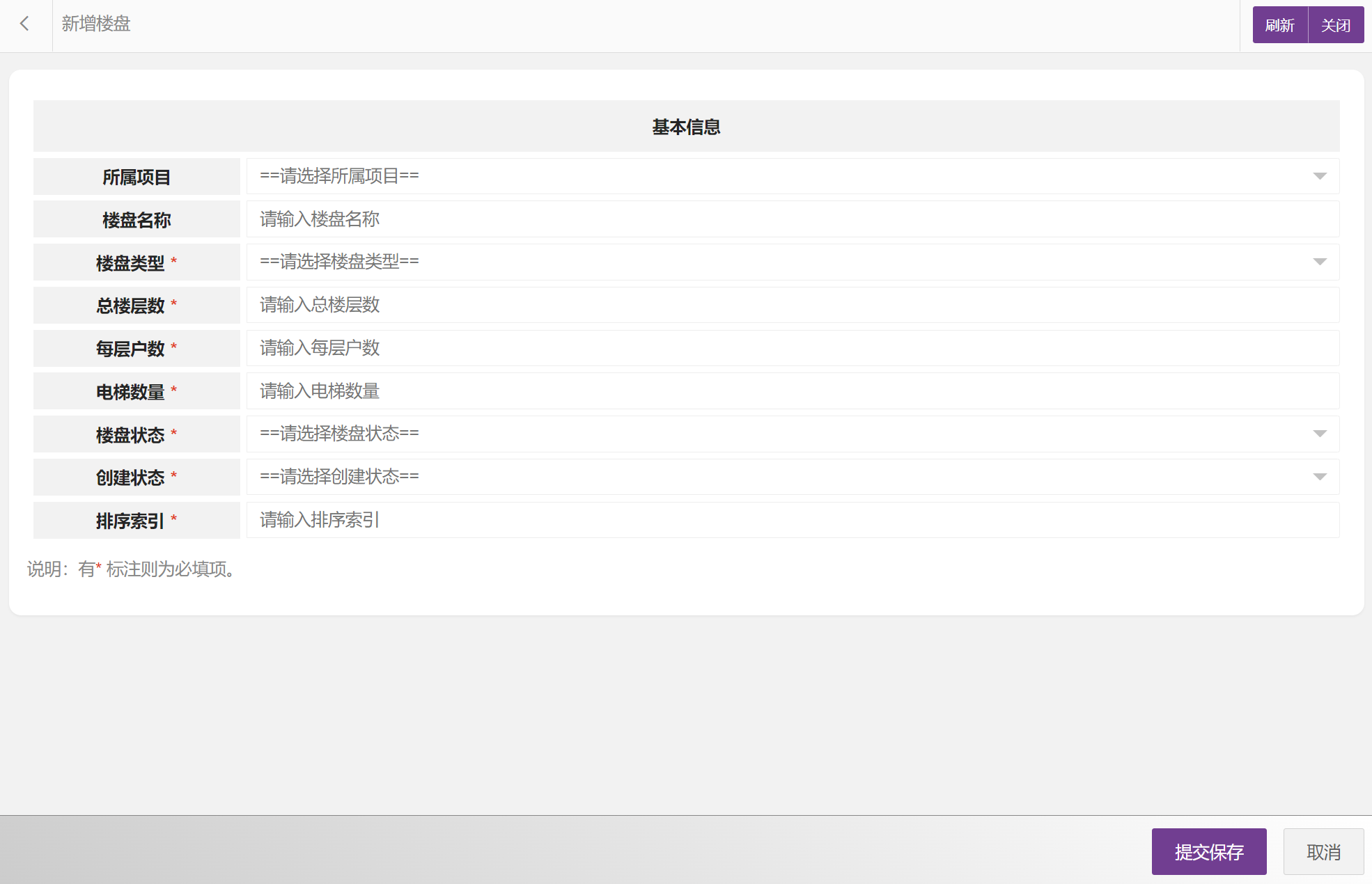 在楼盘列表中可以选择新增楼盘、编辑楼盘、删除楼盘、搜索楼盘等。楼盘属性包括:楼盘编码、所属项目、楼盘名称、楼盘类型、总楼层数、每层户数、电梯数量、楼盘状态等。新增楼盘界面如图所示: