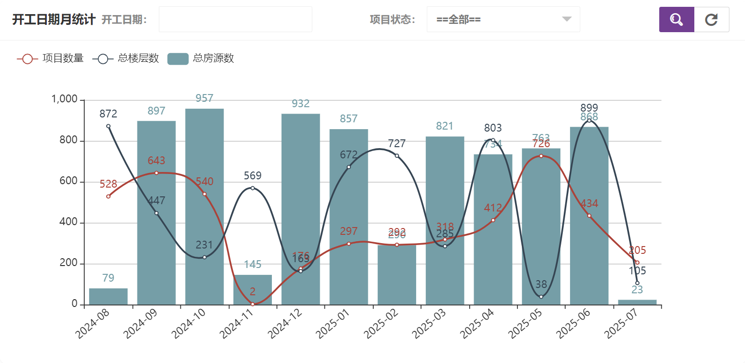 在项目统计中可以看到开工日期年统计、开工日期月统计、开工日期日统计、竣工日期年统计、竣工日期月统计、竣工日期日统计、项目状态统计,开工日期月统计如图所示:
