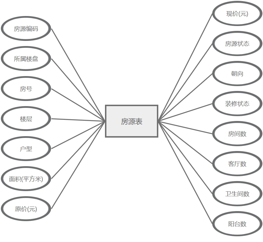 房源管理主要属性包括:房源编码、所属楼盘、房号、楼层、户型、面积(平方米)、原价(元)、现价(元)、房源状态、朝向、装修状态、房间数、客厅数、卫生间数、阳台数。