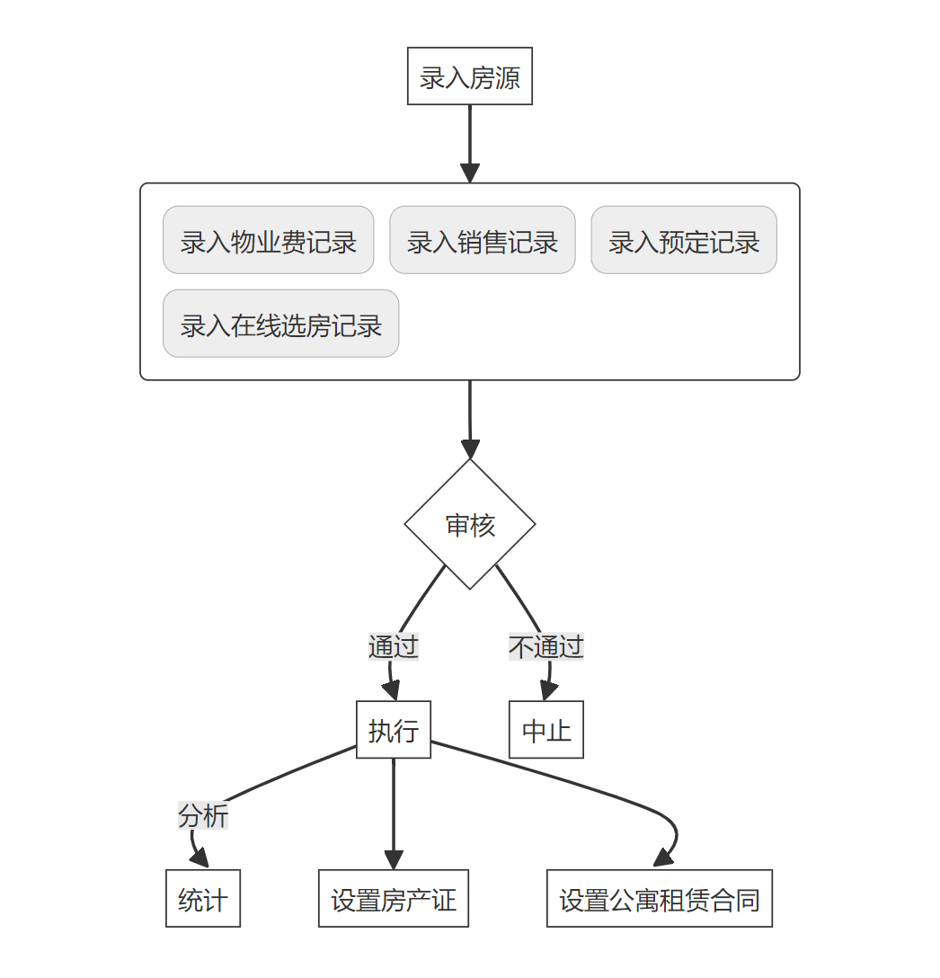 房源管理功能通过录入、查询、变更、审核及统计分析等环节实现。首次数据录入时需输入房号、楼层、户型、面积等基本信息;用户可按条件查询,如房型或区域,并支持模糊搜索;信息变更包括价格调整和状态更新(如上架/下架);部门领导负责数据审核确保准确性;系统提供统计报表用于分析销售趋势及库存情况。
