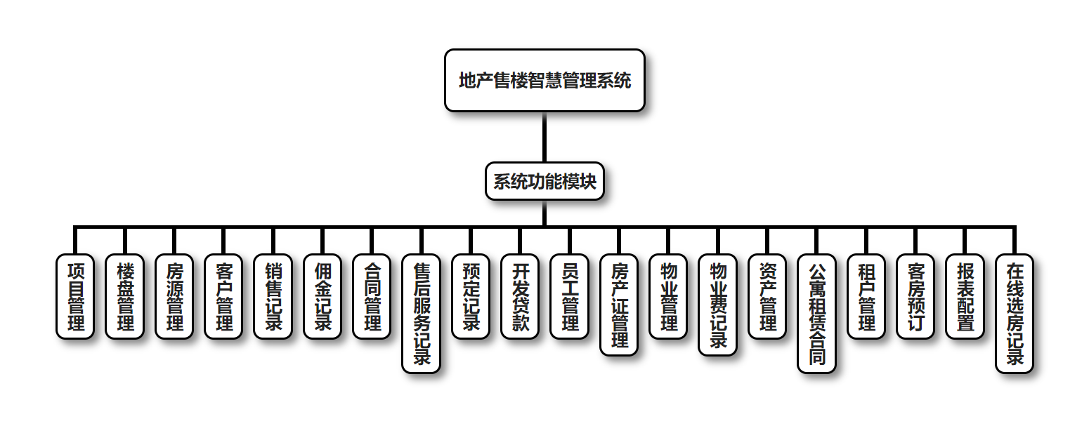 地产售楼智慧管理系统的主要功能包括:项目管理、楼盘管理、房源管理、客户管理、销售记录管理、佣金记录管理、合同管理、售后服务记录管理、预定记录管理、开发贷款管理、员工管理、房产证管理、物业管理、物业费记录管理、资产管理、公寓租赁合同管理、租户管理、客房预订管理、报表配置管理、在线选房记录管理。