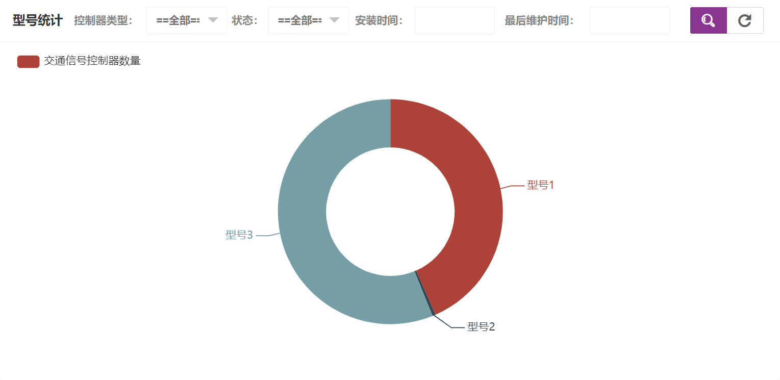 在交通信号控制器统计中可以看到控制器类型统计、型号统计、状态统计、安装时间年统计、安装时间月统计、安装时间日统计、最后维护时间年统计、最后维护时间月统计、最后维护时间日统计,型号统计如图所示: