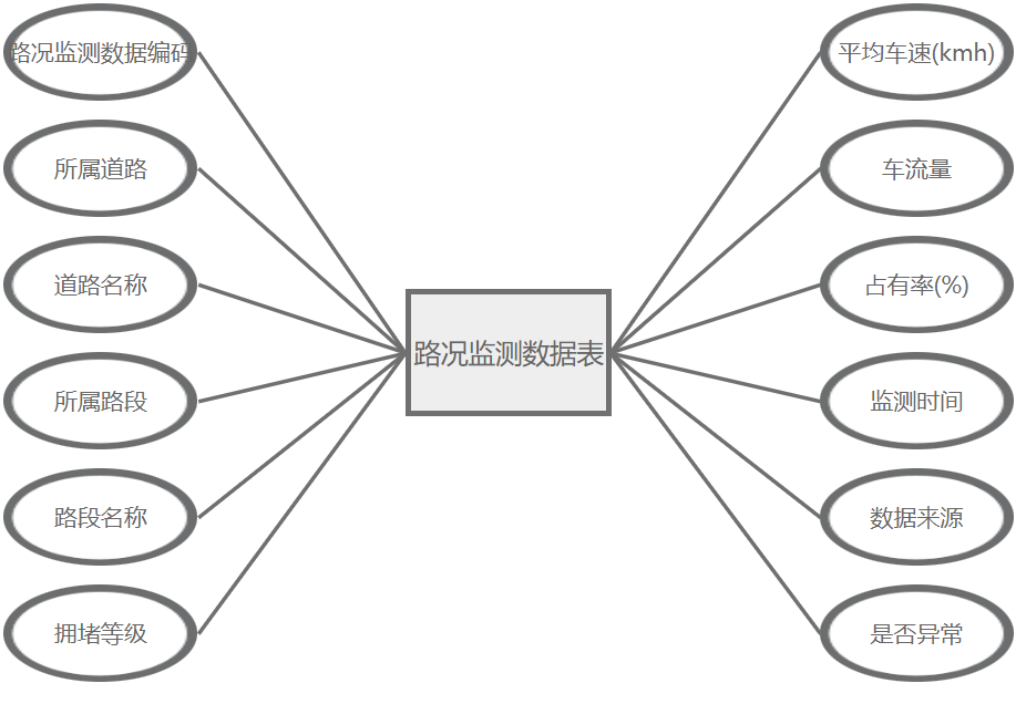 路况监测数据管理主要属性包括:路况监测数据编码、所属道路、道路名称、所属路段、路段名称、拥堵等级、平均车速(kmh)、车流量、占有率(%)、监测时间、数据来源、是否异常。