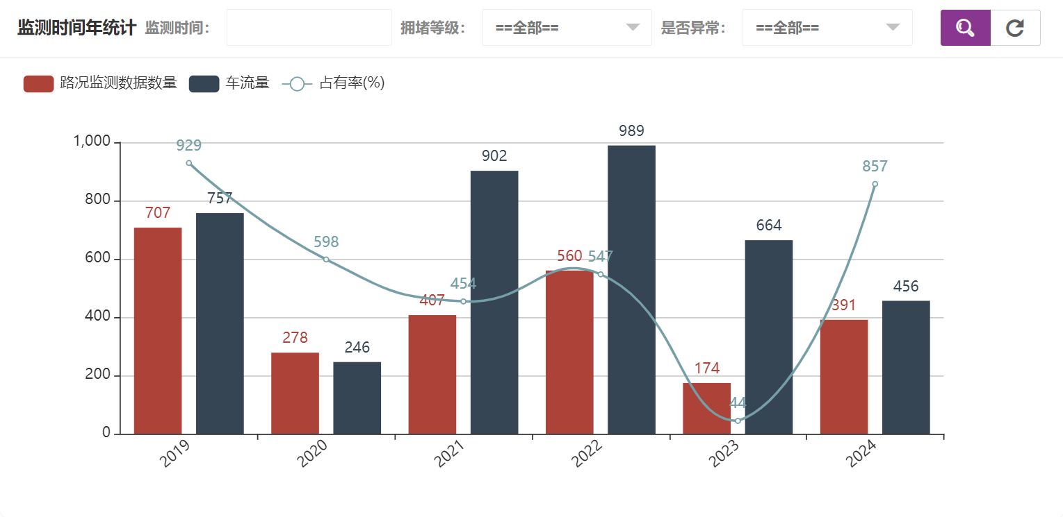 在路况监测数据统计中可以看到拥堵等级统计、监测时间年统计、监测时间月统计、监测时间日统计、是否异常统计,监测时间年统计如图所示: