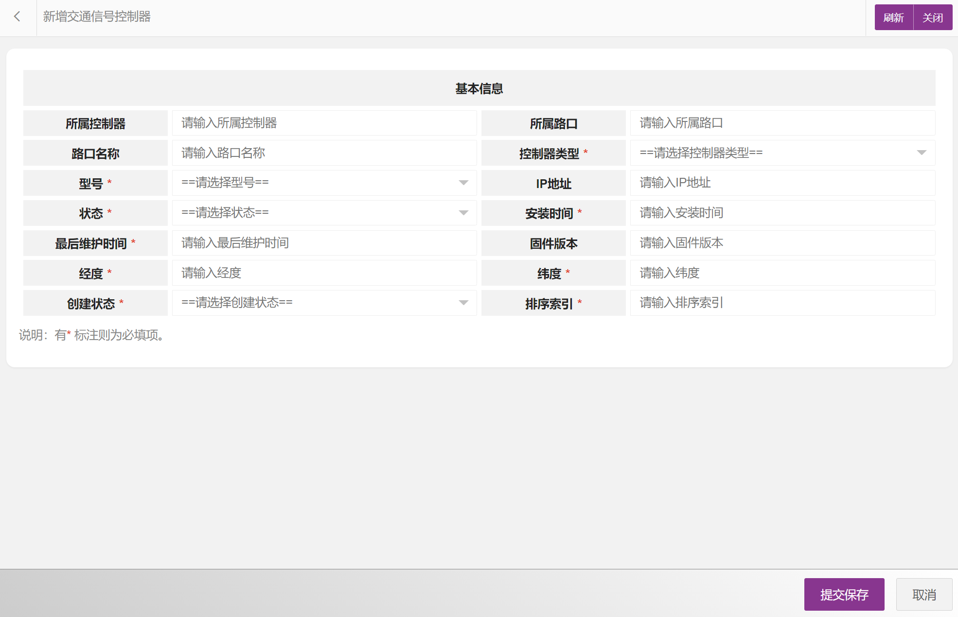 在交通信号控制器列表中可以选择新增交通信号控制器、编辑交通信号控制器、删除交通信号控制器、搜索交通信号控制器等。交通信号控制器属性包括:交通信号控制器编码、所属控制器、所属路口、路口名称、控制器类型、型号、IP地址、状态、安装时间、最后维护时间、固件版本、经度、纬度等。新增交通信号控制器界面如图所示: