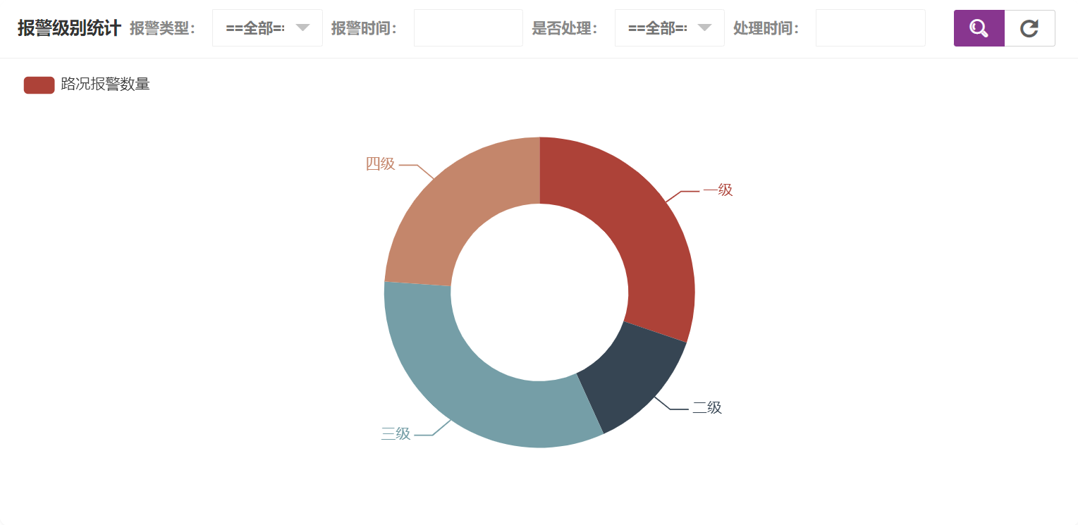 在路况报警统计中可以看到报警类型统计、报警级别统计、报警时间年统计、报警时间月统计、报警时间日统计、是否处理统计、处理时间年统计、处理时间月统计、处理时间日统计,报警级别统计如图所示: