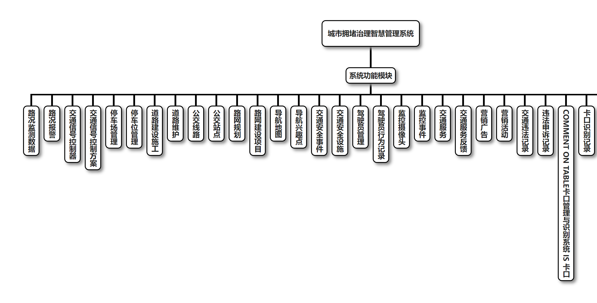 城市拥堵治理智慧管理系统的主要功能包括:路况监测数据管理、路况报警管理、交通信号控制器管理、交通信号控制方案管理、停车场管理、停车位管理、道路建设施工管理、道路维护管理、公交线路管理、公交站点管理、路网规划管理、路网建设项目管理、导航地图管理、导航兴趣点管理、交通安全事件管理、交通安全设施管理、驾驶员管理、驾驶员行为记录管理、监控摄像头管理、监控事件管理、交通服务管理、交通服务反馈管理、营销广告管理、营销活动管理、交通违法记录管理、违法申诉记录管理、COMMENT ON TABLE卡口与识别系统 IS 卡口管理、卡口识别记录管理、自动驾驶车辆管理、自动驾驶车辆行程管理、客运车辆管理、客运班次管理、驾驶员预警管理、车辆追踪管理。