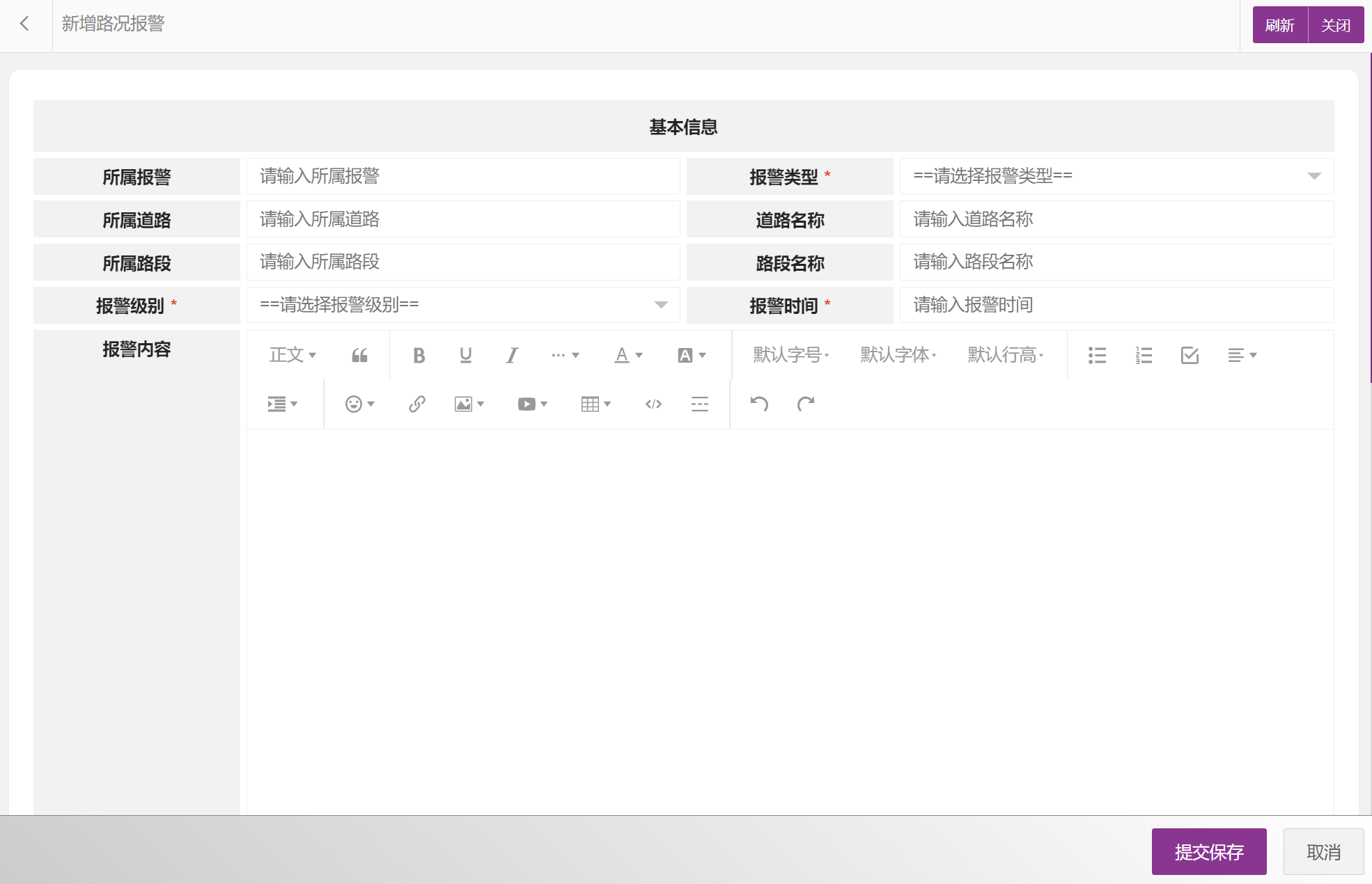 在路况报警列表中可以选择新增路况报警、编辑路况报警、删除路况报警、搜索路况报警等。路况报警属性包括:路况报警编码、所属报警、报警类型、所属道路、道路名称、所属路段、路段名称、报警级别、报警时间、报警内容、是否处理、处理时间、处理结果、所属处理会员、处理会员姓名等。新增路况报警界面如图所示: