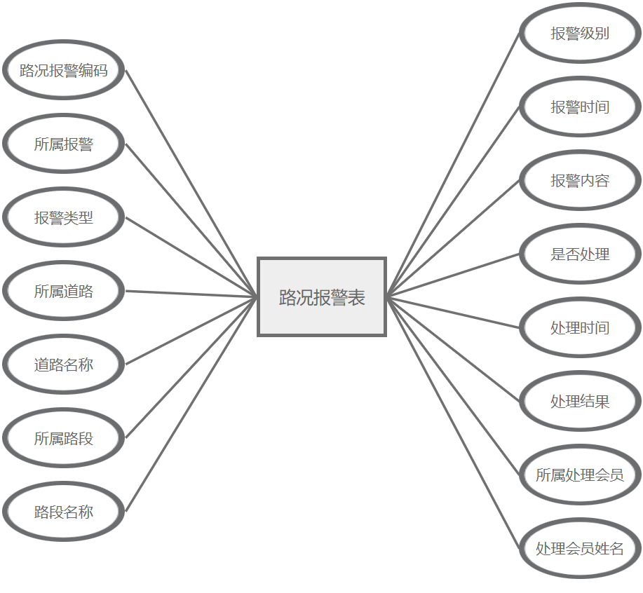 路况报警管理主要属性包括:路况报警编码、所属报警、报警类型、所属道路、道路名称、所属路段、路段名称、报警级别、报警时间、报警内容、是否处理、处理时间、处理结果、所属处理会员、处理会员姓名。