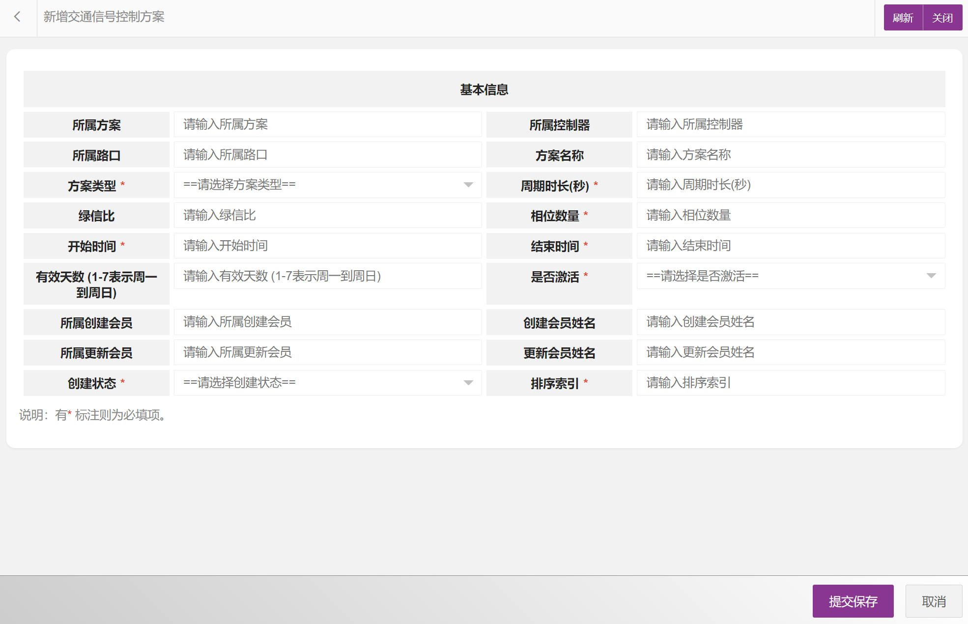 在交通信号控制方案列表中可以选择新增交通信号控制方案、编辑交通信号控制方案、删除交通信号控制方案、搜索交通信号控制方案等。交通信号控制方案属性包括:交通信号控制方案编码、所属方案、所属控制器、所属路口、方案名称、方案类型、周期时长(秒)、绿信比、相位数量、开始时间、结束时间、有效天数 (1-7表示周一到周日)、是否激活、所属创建会员、创建会员姓名、所属更新会员、更新会员姓名等。新增交通信号控制方案界面如图所示: