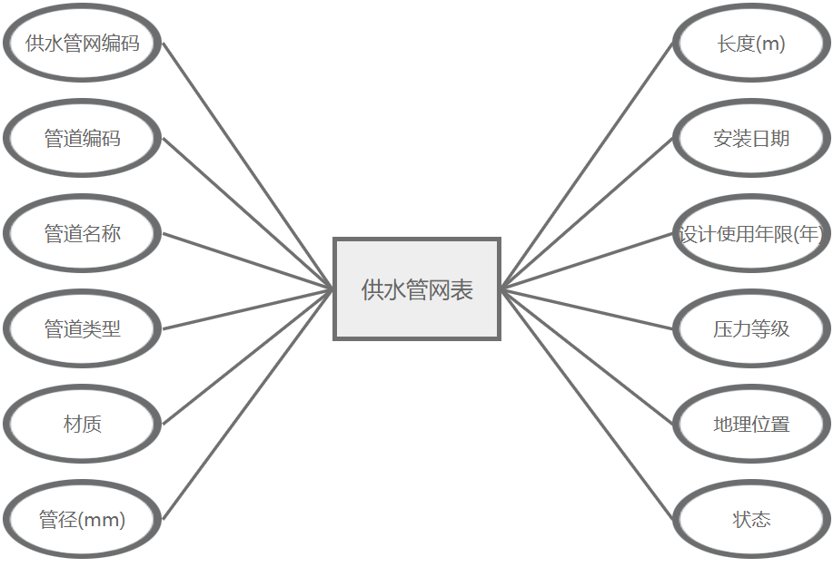 供水管网管理主要属性包括:供水管网编码、管道编码、管道名称、管道类型、材质、管径(mm)、长度(m)、安装日期、设计使用年限(年)、压力等级、地理位置、状态。