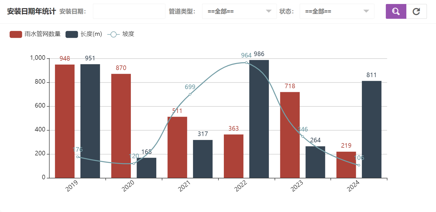 在雨水管网统计中可以看到管道类型统计、安装日期年统计、安装日期月统计、安装日期日统计、状态统计,安装日期年统计如图所示: