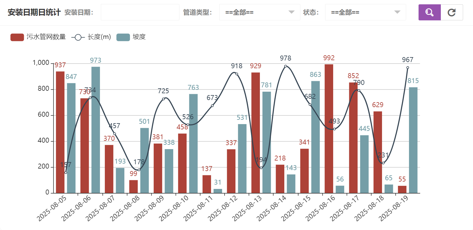 在污水管网统计中可以看到管道类型统计、安装日期年统计、安装日期月统计、安装日期日统计、状态统计,安装日期日统计如图所示: