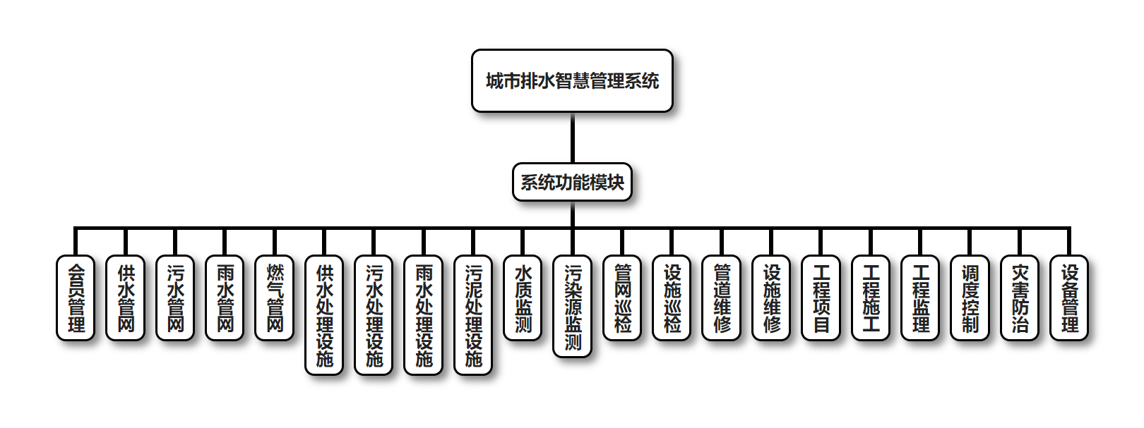 城市排水智慧管理系统的主要功能包括:会员管理、供水管网管理、污水管网管理、雨水管网管理、燃气管网管理、供水处理设施管理、污水处理设施管理、雨水处理设施管理、污泥处理设施管理、水质监测管理、污染源监测管理、管网巡检管理、设施巡检管理、管道维修管理、设施维修管理、工程项目管理、工程施工管理、工程监理管理、调度控制管理、灾害防治管理、设备管理。