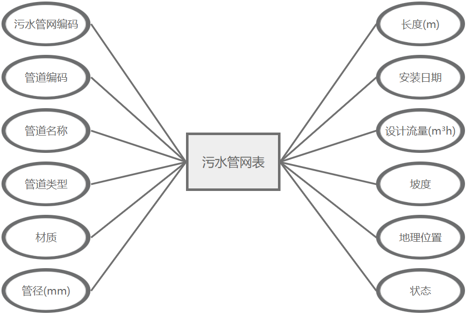 污水管网管理主要属性包括:污水管网编码、管道编码、管道名称、管道类型、材质、管径(mm)、长度(m)、安装日期、设计流量(m³h)、坡度、地理位置、状态。