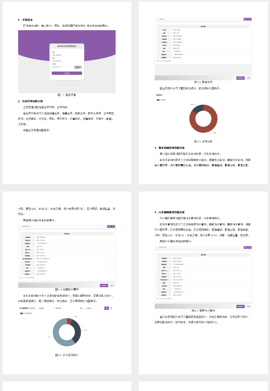 城市排水智慧管理系统主要功能模块包括会员管理、供水管网至污泥处理设施管理及水质与污染源监测,覆盖从数据录入到巡检维护的全过程。系统采用SpringMVC开发框架结合MySQL数据库设计实现,便于普通员工进行日常操作并由部门领导审核统计分析。该选题相比传统项目更具创新性和实用性:摒弃繁琐冗长的传统功能模块设计;提供直观的数据可视化展示,并确保零基础用户能够轻松上手和理解各角色权限及系统逻辑。
