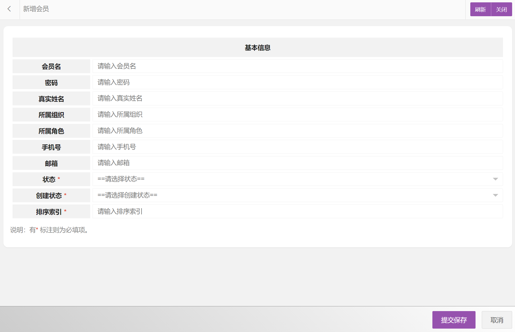 在会员列表中可以选择新增会员、编辑会员、删除会员、搜索会员等。会员属性包括:会员编码、会员名、密码、真实姓名、所属组织、所属角色、手机号、邮箱、状态等。新增会员界面如图所示: