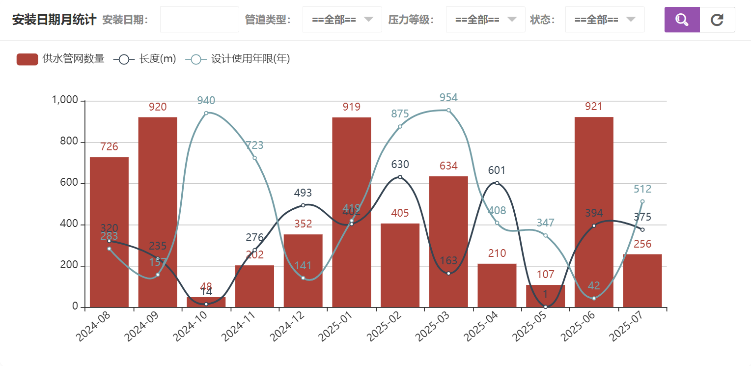 在供水管网统计中可以看到管道类型统计、安装日期年统计、安装日期月统计、安装日期日统计、压力等级统计、状态统计,安装日期月统计如图所示: