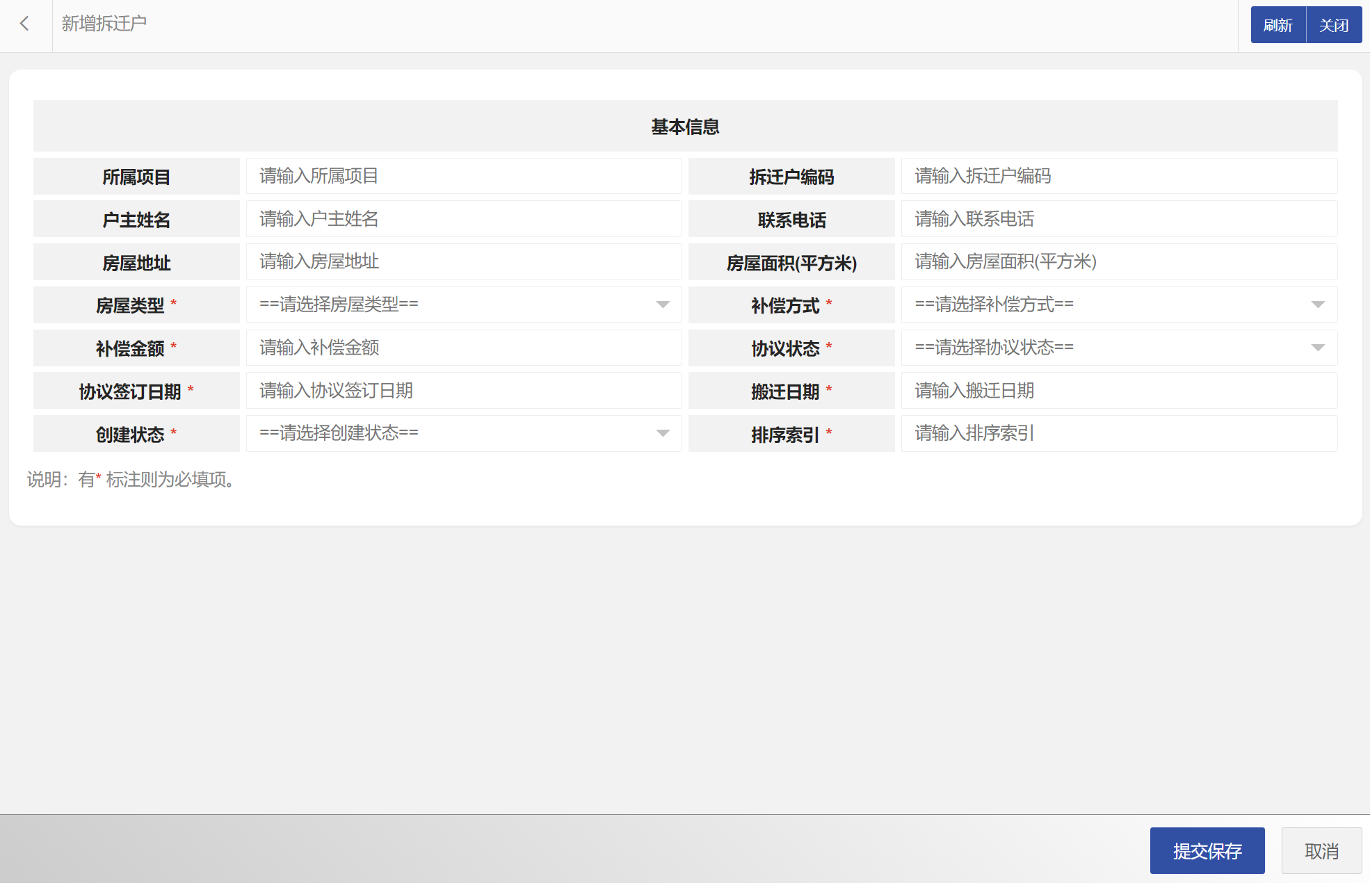 在拆迁户列表中可以选择新增拆迁户、编辑拆迁户、删除拆迁户、搜索拆迁户等。拆迁户属性包括:拆迁户编码、所属项目、拆迁户编码、户主姓名、联系电话、房屋地址、房屋面积(平方米)、房屋类型、补偿方式、补偿金额、协议状态、协议签订日期、搬迁日期等。新增拆迁户界面如图所示: