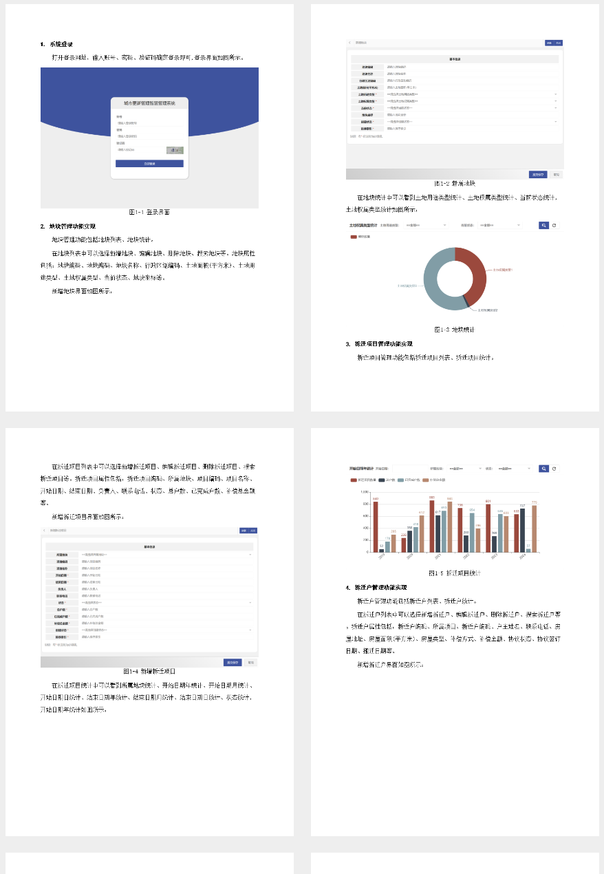 城市更新管理智慧管理系统旨在提高管理水平与效率,主要功能模块涵盖地块、拆迁项目、拆迁户等基础信息的管理和维护。其中地块管理记录了地块编码、面积及用途类型;拆迁项目包括详细数据如编码、开始结束日期以及补偿金额;拆迁户则涉及姓名和房屋属性等个人信息。土地招拍挂管理处理拍卖和挂牌交易,建设用地规划与建筑设计分别关注用地性质和技术指标,工程项目覆盖从立项到竣工的全生命周期。工程进度记录提供实时更新状态及图片说明;质量检查和安全检查确保施工过程符合规范要求。供应商、材料库及其出入库均实现了物资全面跟踪,并通过资产管理维护公司财产信息。员工管理包含详细个人信息与职位职责分配。知识库管理和接收者消息系统支持内部沟通,经典案例展示成功项目经验。培训课程及参与者管理系统进行人员能力提升和追踪学习效果。整个系统的开发基于SpringMVC框架,数据库选用MySQL存储各类数据字段属性,并通过Web前端技术实现用户友好界面,借助ECharts.js等工具丰富信息可视化功能。