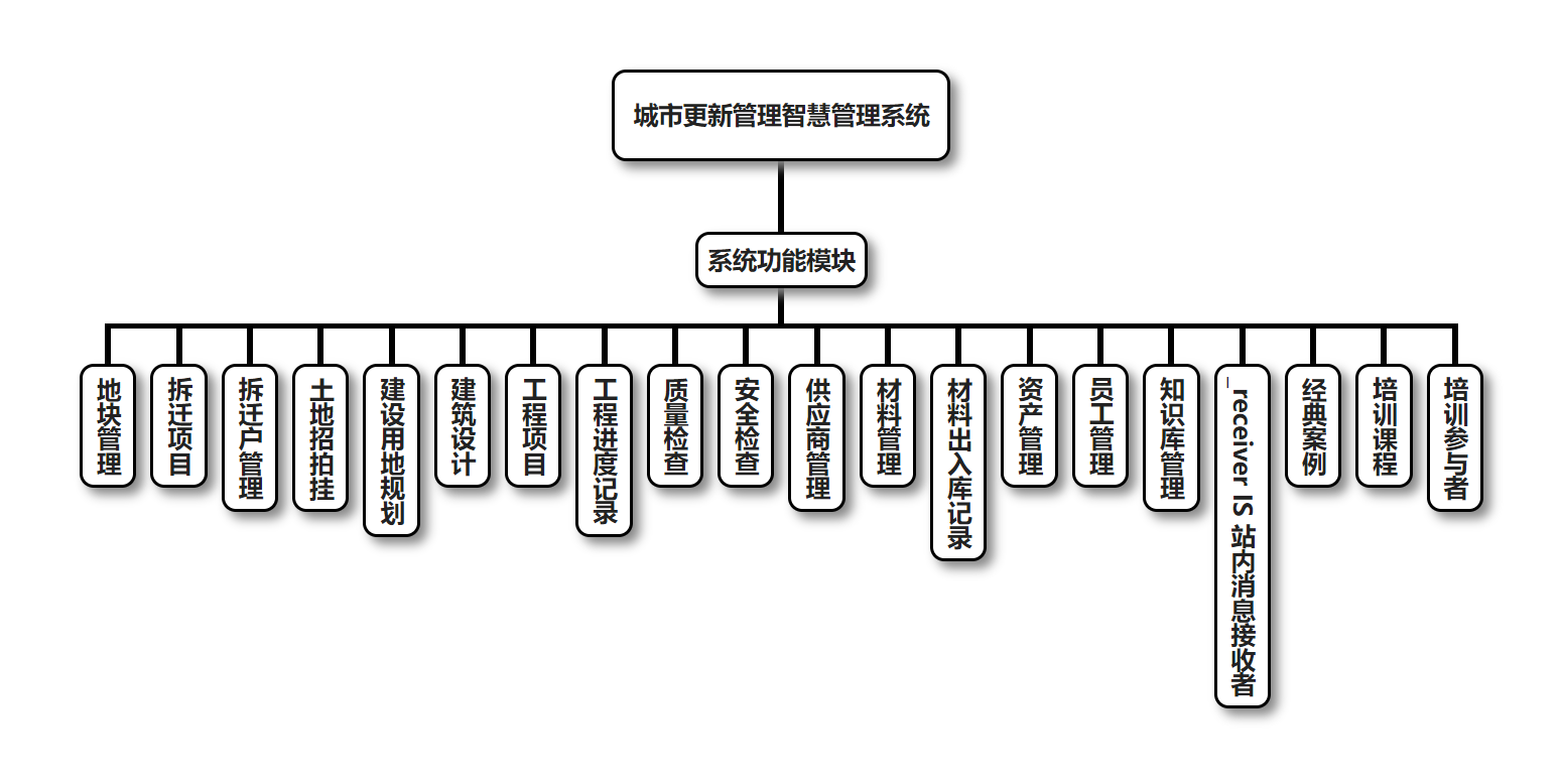 城市更新管理智慧管理系统的主要功能包括:地块管理、拆迁项目管理、拆迁户管理、土地招拍挂管理、建设用地规划管理、建筑设计管理、工程项目管理、工程进度记录管理、质量检查管理、安全检查管理、供应商管理、材料管理、材料出入库记录管理、资产管理、员工管理、知识库管理、_receiver IS 站内消息接收者管理、经典案例管理、培训课程管理、培训参与者管理。