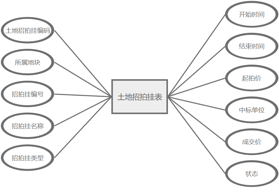 土地招拍挂管理主要属性包括:土地招拍挂编码、所属地块、招拍挂编号、招拍挂名称、招拍挂类型、开始时间、结束时间、起拍价、中标单位、成交价、状态。