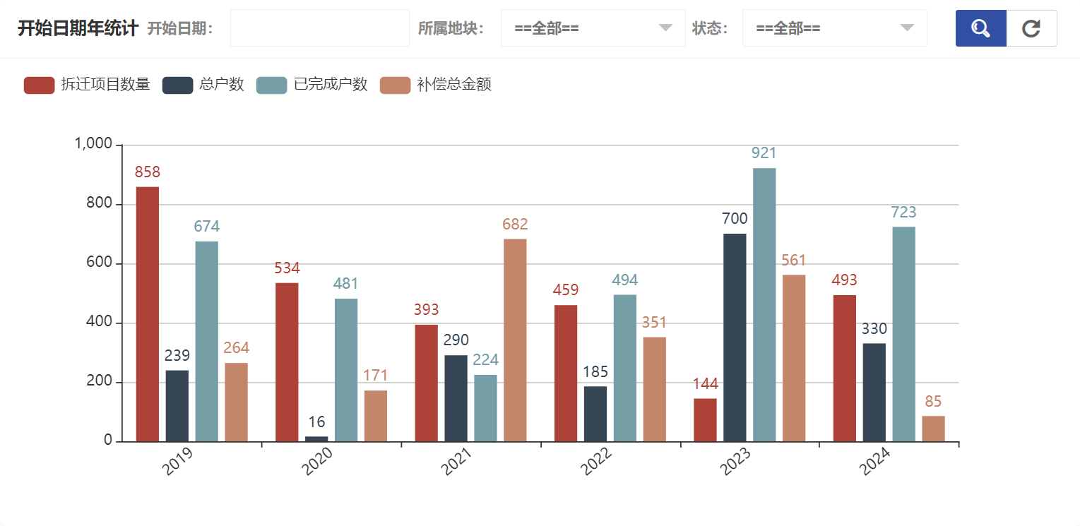 在拆迁项目统计中可以看到所属地块统计、开始日期年统计、开始日期月统计、开始日期日统计、结束日期年统计、结束日期月统计、结束日期日统计、状态统计,开始日期年统计如图所示:
