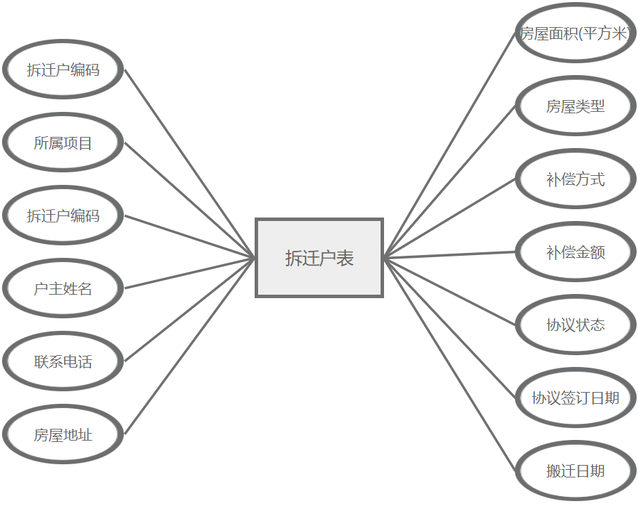 拆迁户管理主要属性包括:拆迁户编码、所属项目、拆迁户编码、户主姓名、联系电话、房屋地址、房屋面积(平方米)、房屋类型、补偿方式、补偿金额、协议状态、协议签订日期、搬迁日期。