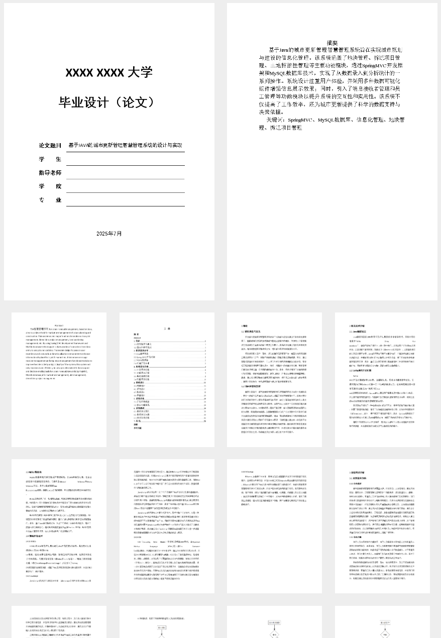 城市更新管理智慧管理系统集地块、拆迁项目、土地招拍挂等多模块于一体,提供从数据录入到统计分析的全方位服务。系统采用SpringMVC开发框架与MySQL数据库组合,实现高效的数据管理和实时监控功能。普通员工负责基础操作及信息维护,部门领导则进行关键环节审核和数据分析。该系统创新性地集成多种管理工具和技术,显著提升了城市更新项目的管理水平和效率。相较于传统选题,“烂大街”的模式化设计难以满足复杂的城市管理工作需求;而本系统的多功能模块划分清晰、实用性强,在功能实现上采用数据可视化及消息管理系统等先进技术手段,使得零基础开发者也能轻松掌握系统开发与维护的技巧。