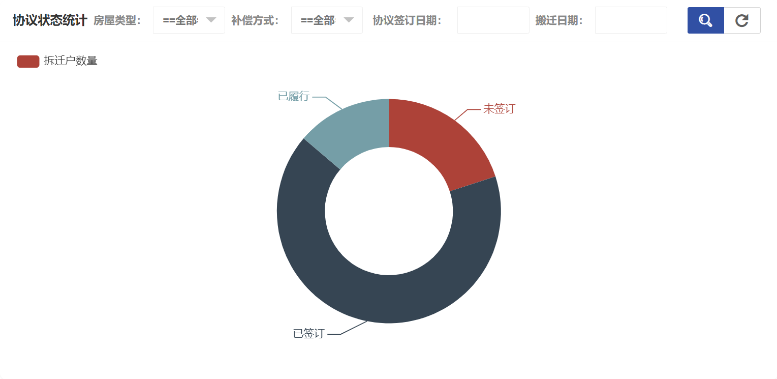 在拆迁户统计中可以看到房屋类型统计、补偿方式统计、协议状态统计、协议签订日期年统计、协议签订日期月统计、协议签订日期日统计、搬迁日期年统计、搬迁日期月统计、搬迁日期日统计,协议状态统计如图所示: