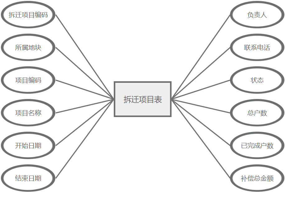 拆迁项目管理主要属性包括:拆迁项目编码、所属地块、项目编码、项目名称、开始日期、结束日期、负责人、联系电话、状态、总户数、已完成户数、补偿总金额。