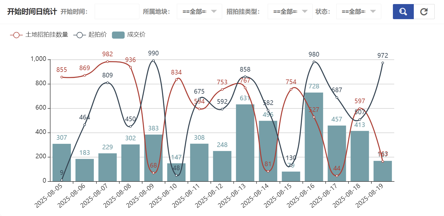 在土地招拍挂统计中可以看到所属地块统计、招拍挂类型统计、开始时间年统计、开始时间月统计、开始时间日统计、结束时间年统计、结束时间月统计、结束时间日统计、状态统计,开始时间日统计如图所示: