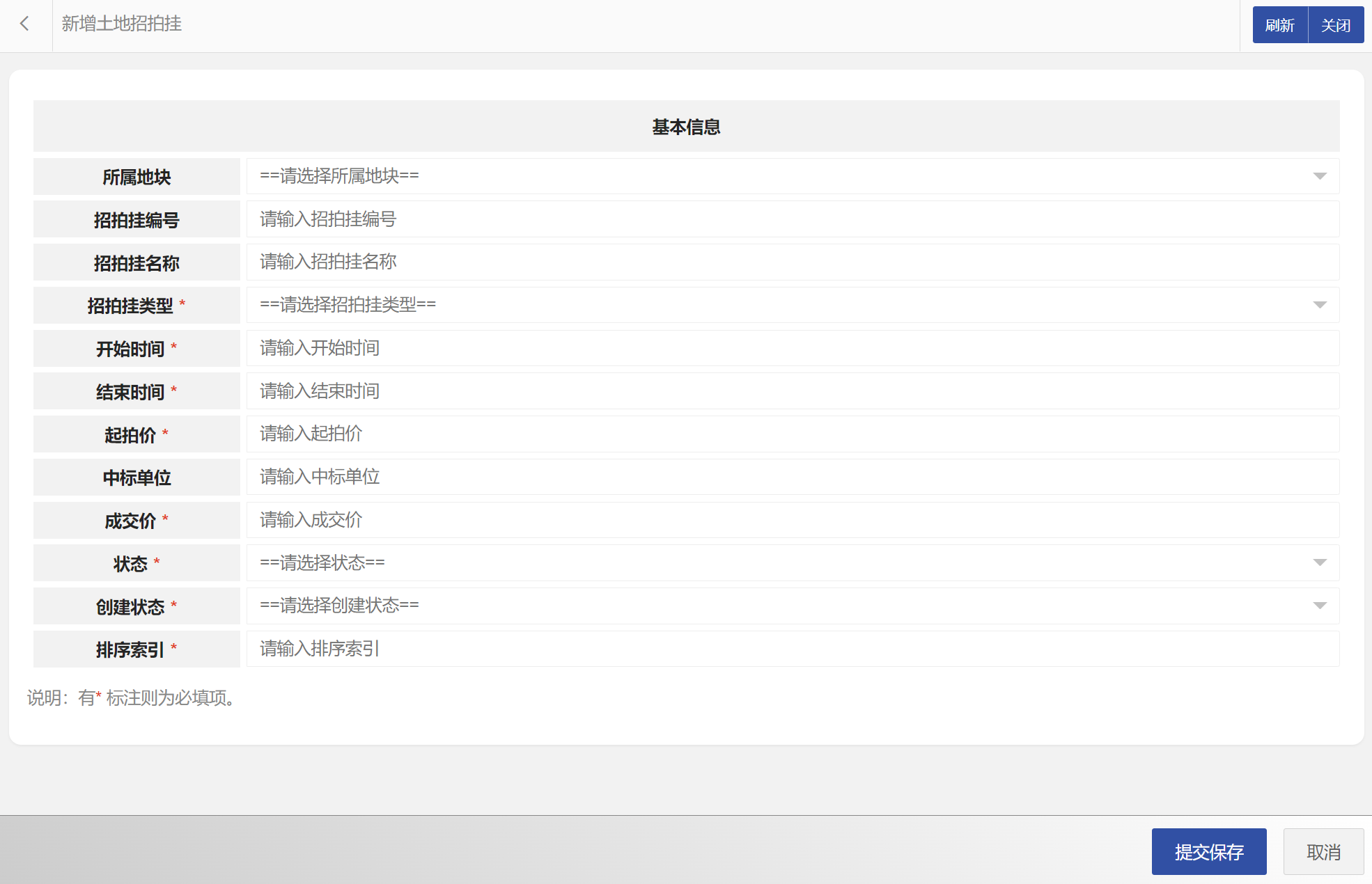 在土地招拍挂列表中可以选择新增土地招拍挂、编辑土地招拍挂、删除土地招拍挂、搜索土地招拍挂等。土地招拍挂属性包括:土地招拍挂编码、所属地块、招拍挂编号、招拍挂名称、招拍挂类型、开始时间、结束时间、起拍价、中标单位、成交价、状态等。新增土地招拍挂界面如图所示: