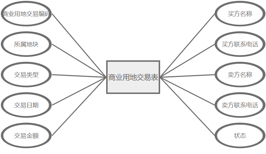 商业用地交易管理主要属性包括:商业用地交易编码、所属地块、交易类型、交易日期、交易金额、买方名称、买方联系电话、卖方名称、卖方联系电话、状态。