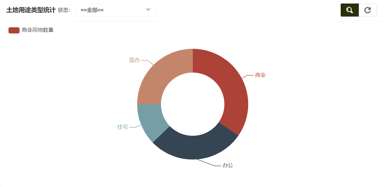 在商业用地统计中可以看到土地用途类型统计、状态统计,土地用途类型统计如图所示: