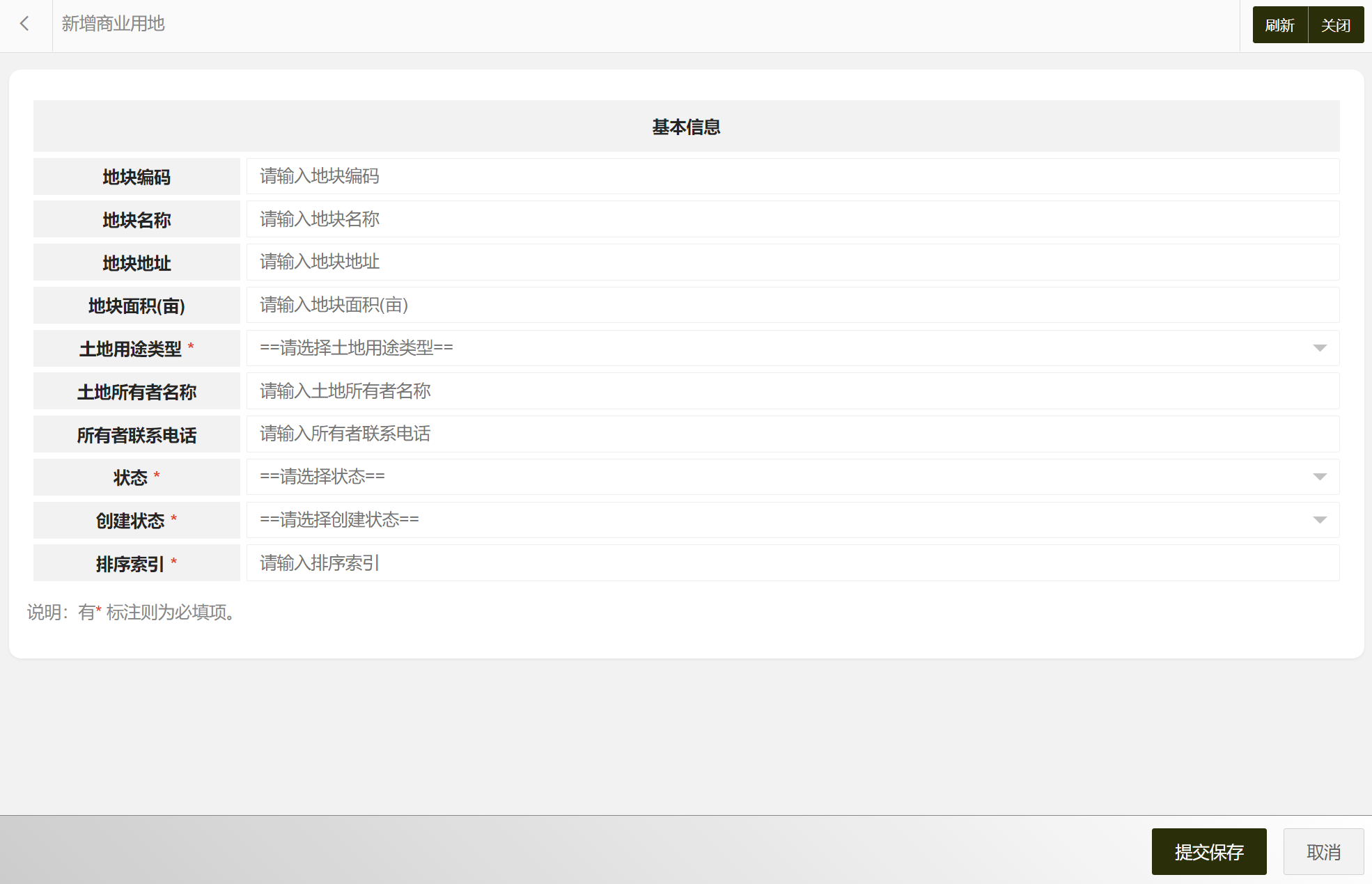 在商业用地列表中可以选择新增商业用地、编辑商业用地、删除商业用地、搜索商业用地等。商业用地属性包括:商业用地编码、地块编码、地块名称、地块地址、地块面积(亩)、土地用途类型、土地所有者名称、所有者联系电话、状态等。新增商业用地界面如图所示: