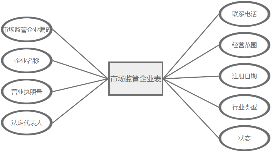 市场监管企业管理主要属性包括:市场监管企业编码、企业名称、营业执照号、法定代表人、联系电话、经营范围、注册日期、行业类型、状态。