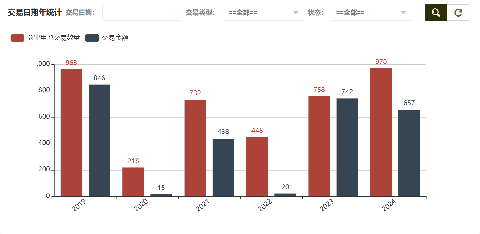 在商业用地交易统计中可以看到交易类型统计、交易日期年统计、交易日期月统计、交易日期日统计、状态统计,交易日期年统计如图所示: